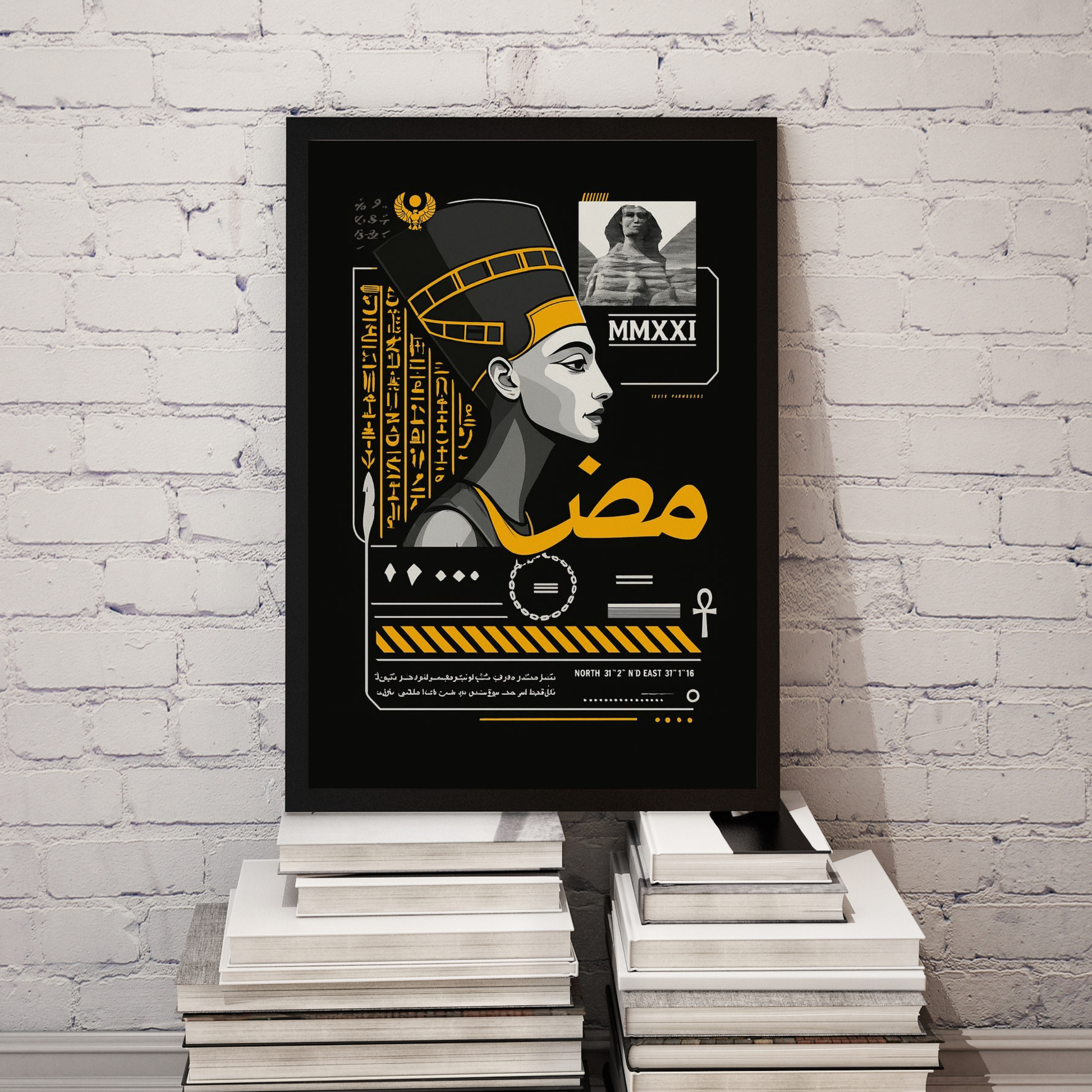 A stunning wall art print that masterfully blends ancient Egyptian heritage with a sleek, modern aesthetic. The design features a stylized profile illustration of Queen Nefertiti, rendered in a contemporary vector style using a bold black and gold color palette. The centerpiece is the word "مصر" (Masr - Egypt) in large, innovative golden Arabic calligraphy. This unique piece is further detailed with hieroglyphic symbols, an inset image of the Sphinx, and futuristic graphic elements, creating a sophisticated fusion of history and modernity.